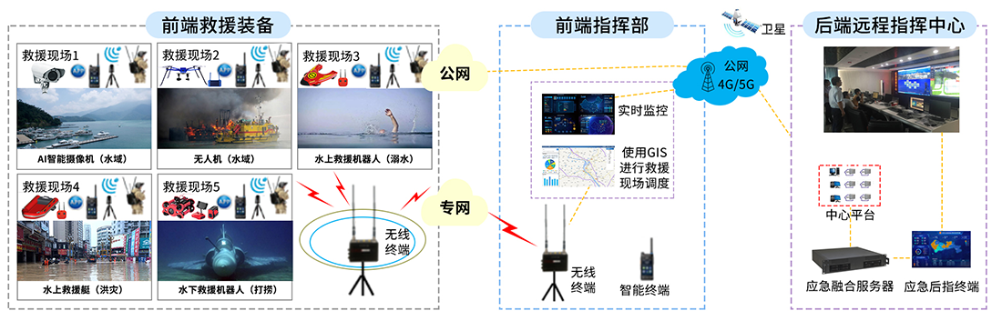 海事管理系統(tǒng)是自主研發(fā)的一套集后端遠(yuǎn)程指揮中心、前端指揮部及前端救援裝備于一體的水域救援系統(tǒng)。后端指揮中心應(yīng)急指揮平臺分級管理及調(diào)度,前方救援現(xiàn)場數(shù)據(jù)的上傳并及時(shí)進(jìn)行指令的下達(dá),從而提高決策效率和救援效率。所有前端智能設(shè)備均與前端指揮部及后端指揮中心通過無線進(jìn)行通信,前端遠(yuǎn)程指揮中心根據(jù)其所接收的智能設(shè)備數(shù)據(jù)統(tǒng)一進(jìn)行調(diào)度,指揮救援工作有序進(jìn)行。