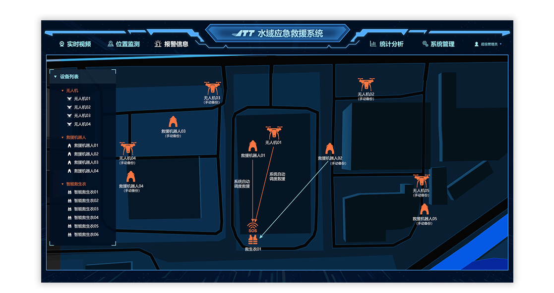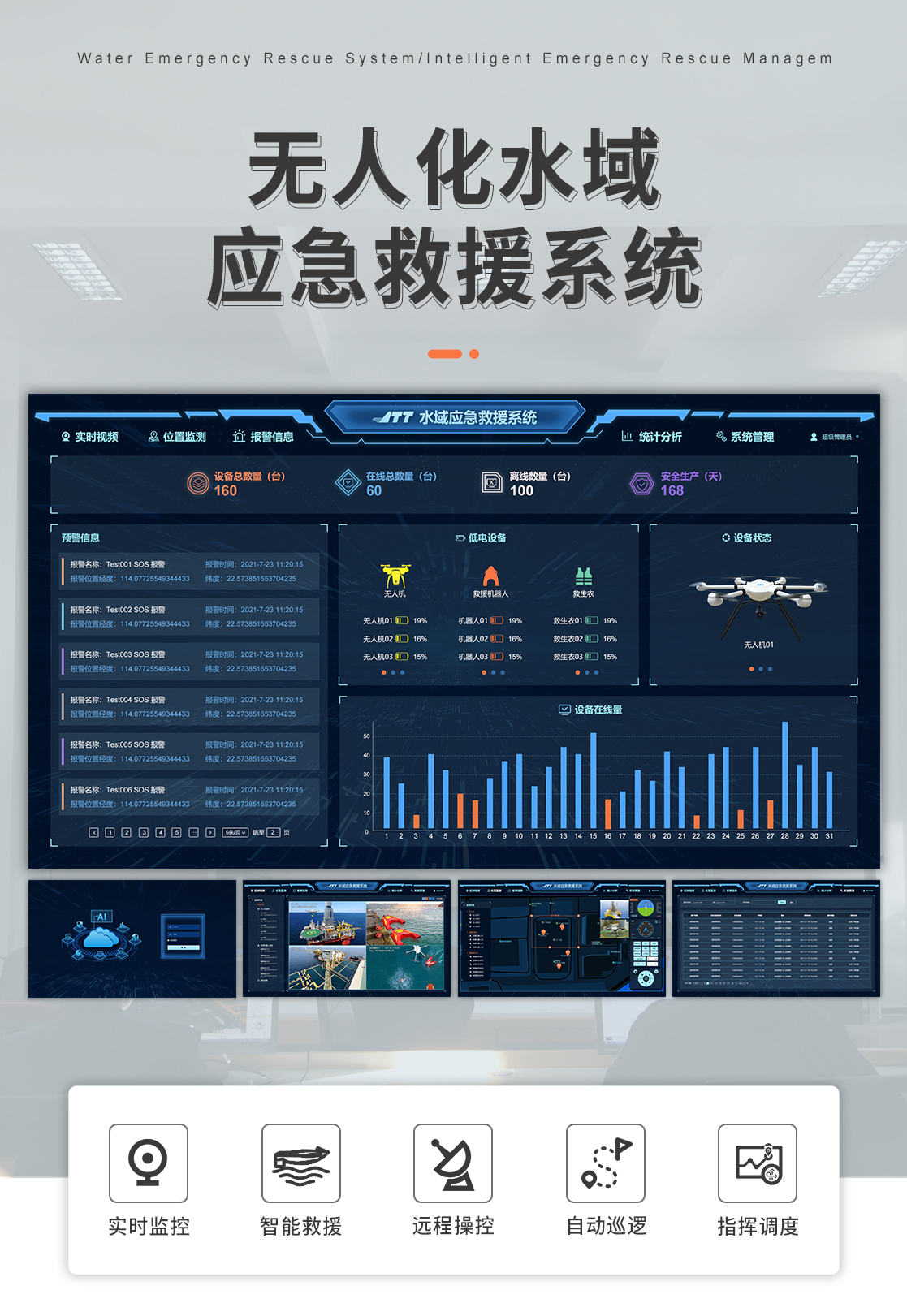 2021年10月,廣州珠江某河段,一名市民在橋上觀光時(shí)不慎落水,墜入江水中央,離岸較遠(yuǎn),水流湍急,情況十分危急。但是,該河段已提前部署智璟無(wú)人化水域應(yīng)急救援系統(tǒng),落水人員在進(jìn)入此水域時(shí)就已被附近的AI攝像頭捕捉到信息。在人員落水的一瞬間,觸發(fā)系統(tǒng)報(bào)警,系統(tǒng)自動(dòng)調(diào)度部署在落水點(diǎn)最近的水上救援機(jī)器人與正在巡邏的無(wú)人機(jī)同時(shí)前往救援。無(wú)人機(jī)投放救生包,救援機(jī)器人接住落水者,短短1分鐘便將落水者救上岸。后臺(tái)指揮中心實(shí)時(shí)監(jiān)控和指揮調(diào)度整個(gè)救援過(guò)程。