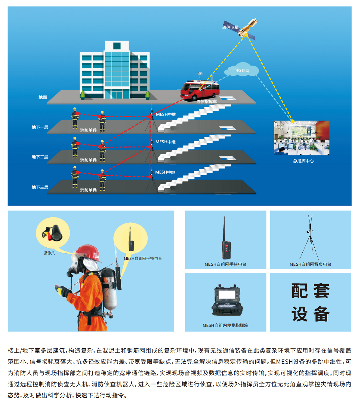 樓上/地下室多層建筑,構造復雜,在混泥土和鋼筋網組成的復雜環(huán)境中,現(xiàn)有無線通信裝備在此類復雜環(huán)境下應用時存在信號覆蓋范圍小、信號損耗衰落大、抗多徑效應能力差、帶寬受限等缺點,無法完全解決信息穩(wěn)定傳輸的問題。但MESH設備的多跳中繼性,可為消防人員與現(xiàn)場指揮部之間打造穩(wěn)定的寬帶通信鏈路,實現(xiàn)現(xiàn)場音視頻及數據信息的實時傳輸,實現(xiàn)可視化的指揮調度。同時現(xiàn)通過遠程控制消防偵查無人機、消防偵査機器人,進入一些危險區(qū)域進行偵查,以便場外指揮員全方位無死角直觀掌控災情現(xiàn)場內態(tài)勢,及時做出科學分析,快速下達行動指令。