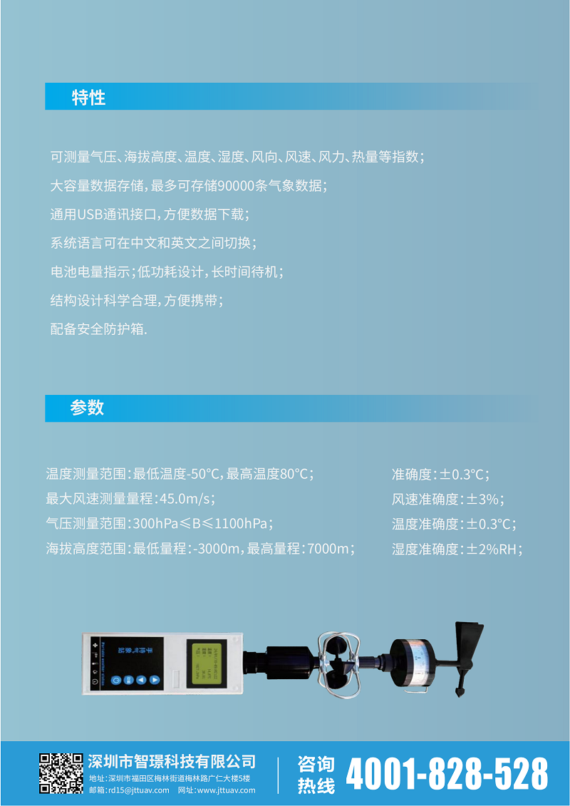 可測量氣壓、海拔高度、溫度、濕度、風(fēng)向、風(fēng)速、風(fēng)力、熱量等指數(shù)