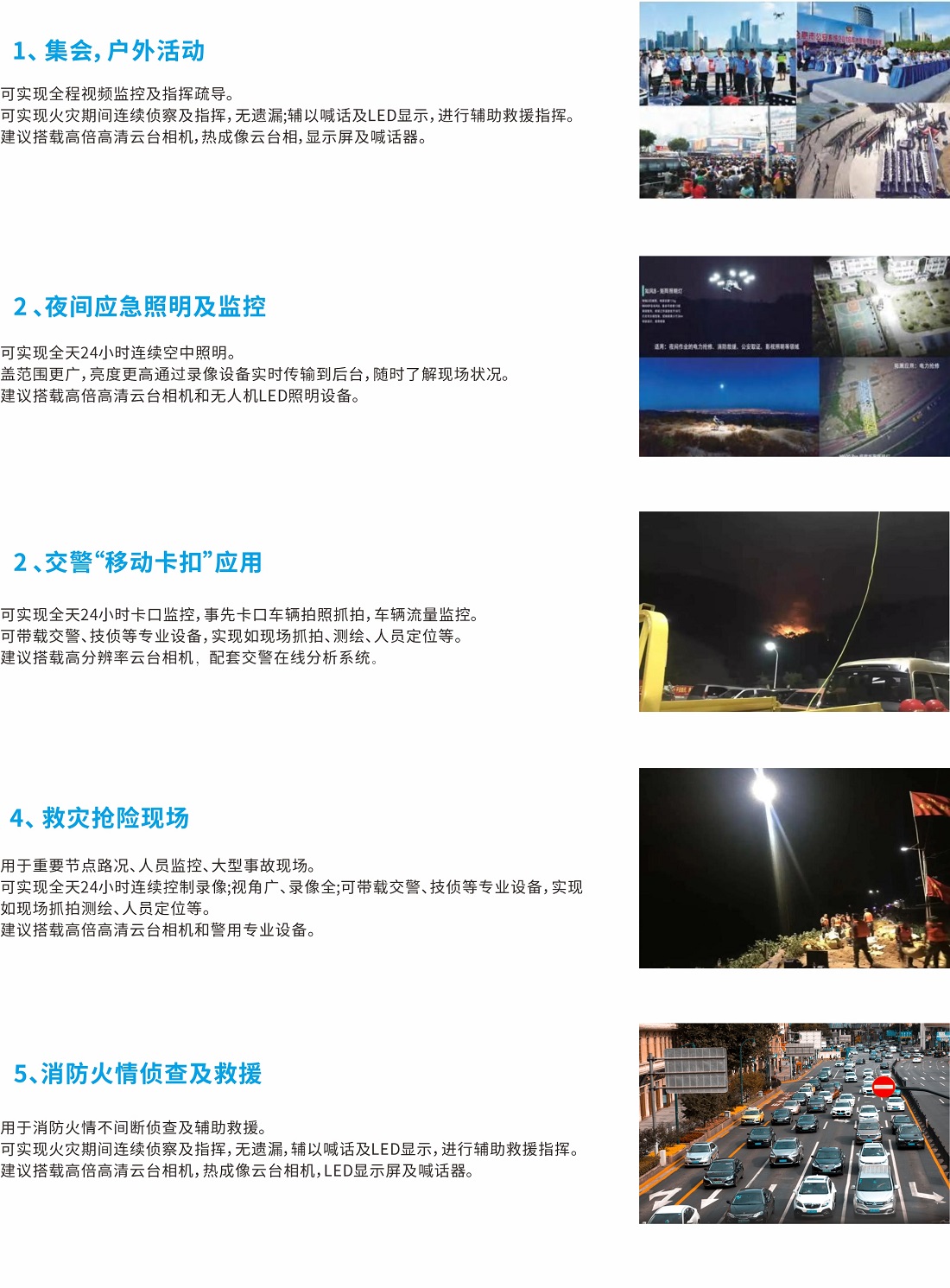 無人機 無人機軸距:1350mm 通訊距離:5000米 產(chǎn)品重量:23kg(不含系留光電線纜) 飛行高度:150m 最大載荷:5kg 遙控器顯示屏:5.5寸(高清) 最大照明范圍:6000 平方米