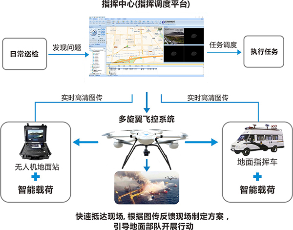 JTT無人機(jī)應(yīng)急指揮調(diào)度平臺(tái)將無人機(jī)飛行平臺(tái)與其他業(yè)務(wù)系統(tǒng)無縫隙地連接成一個(gè)有機(jī)整體,解決無人機(jī)在執(zhí)法單位應(yīng)用中存在的技術(shù)難點(diǎn)及應(yīng)用盲區(qū)。
